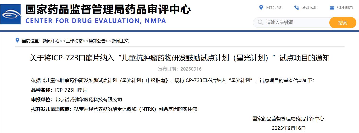 關于將ICP-723口崩片納入“兒童抗腫瘤藥物研發鼓勵試點計劃(星光計劃)”試點項目的通知