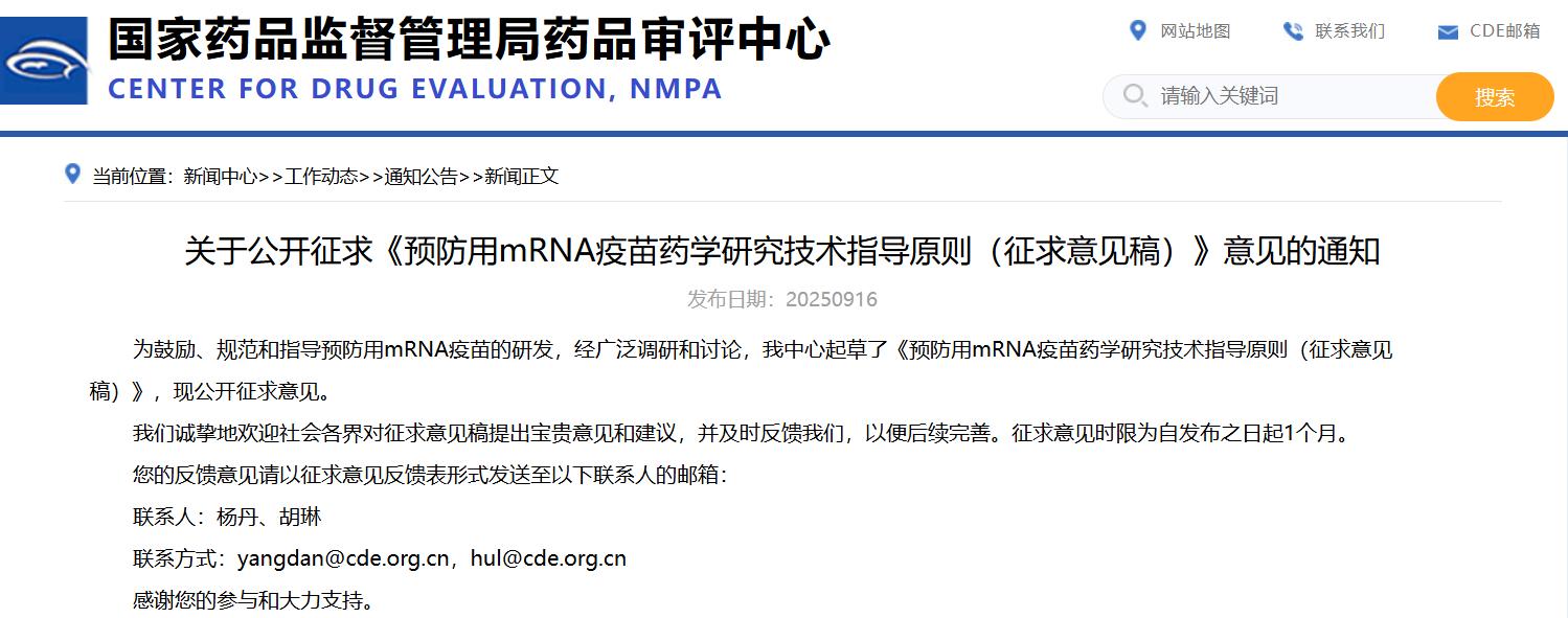 關于公開征求《預防用mRNA疫苗藥學研究技術指導原則(征求意見稿)》意見的通知