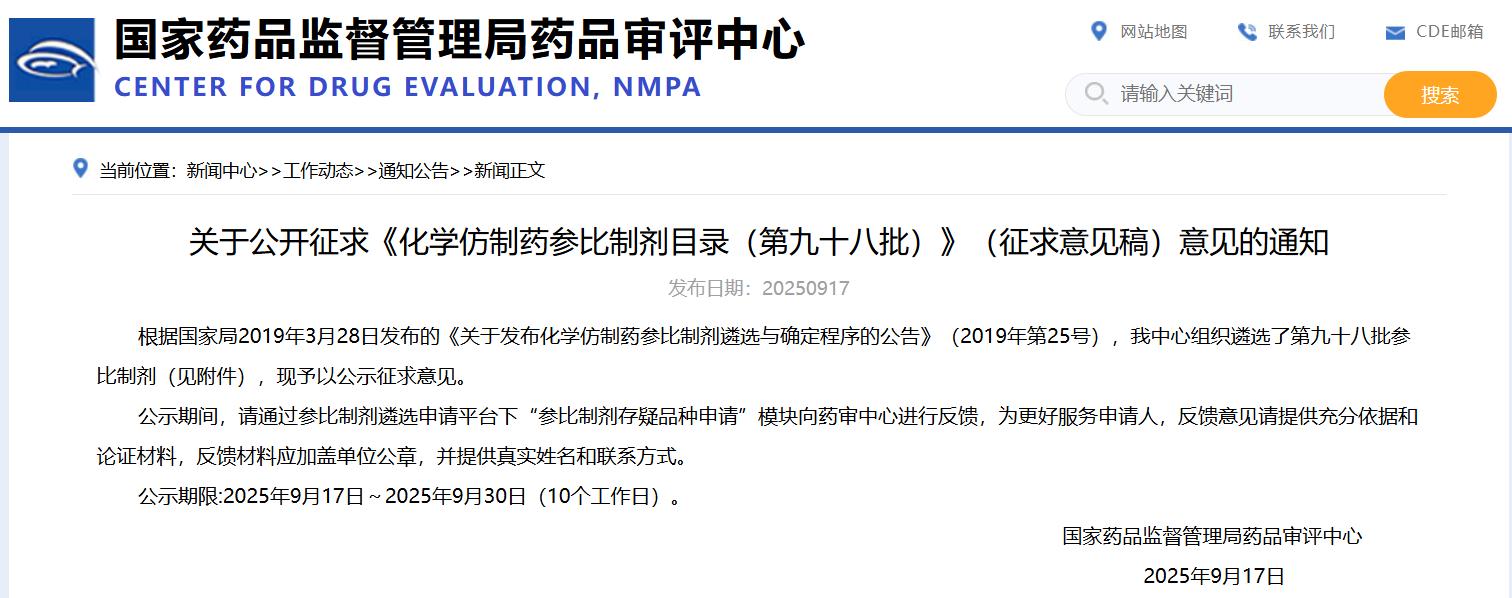 關于公開征求《化學仿制藥參比制劑目錄(第九十八批)》(征求意見稿)意見的通知