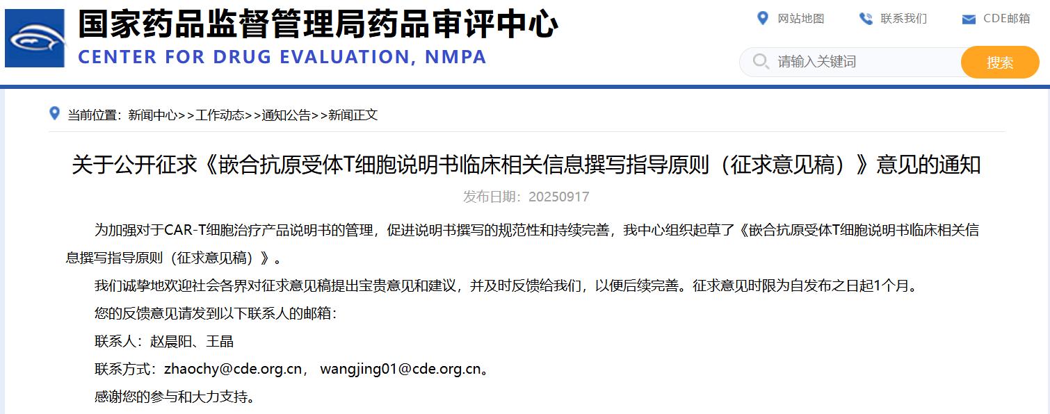 關于公開征求《嵌合抗原受體T細胞說明書臨床相關信息撰寫指導原則(征求意見稿)》意見的通知