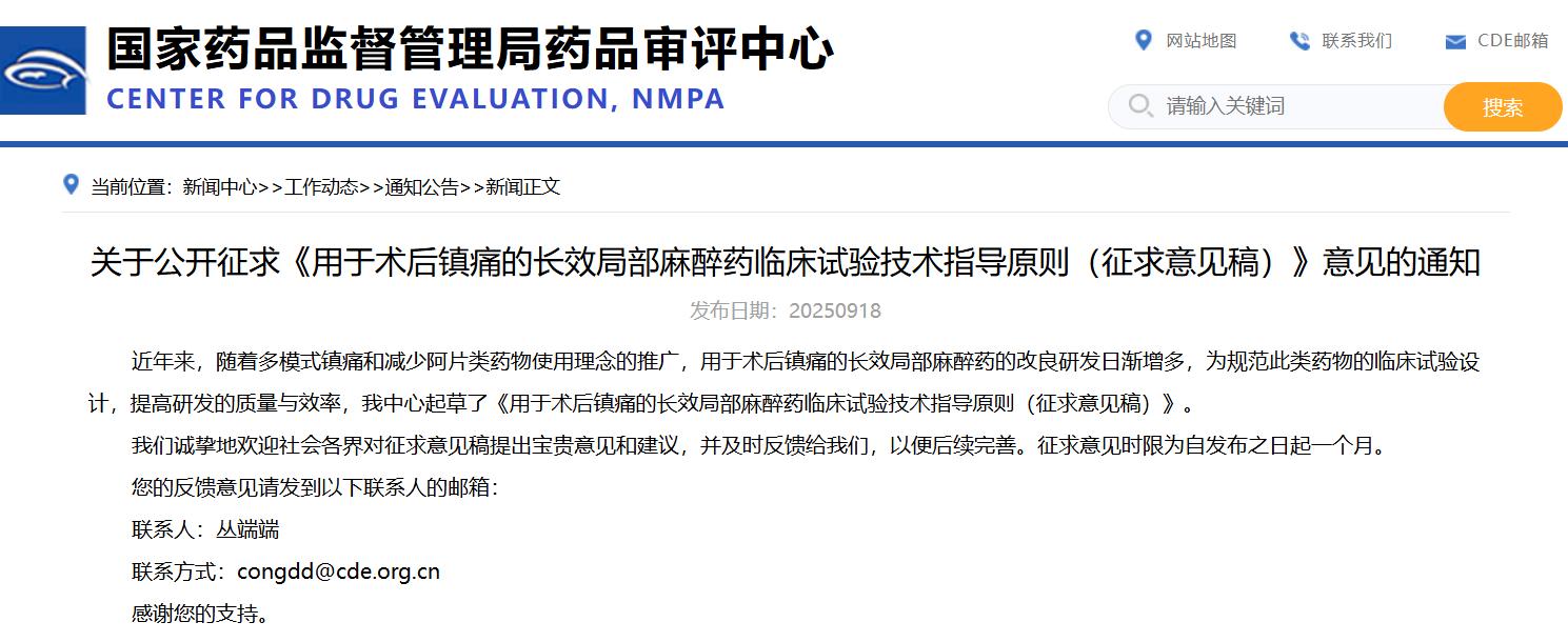 關于公開征求《用于術后鎮痛的長效局部麻醉藥臨床試驗技術指導原則(征求意見稿)》意見的通知