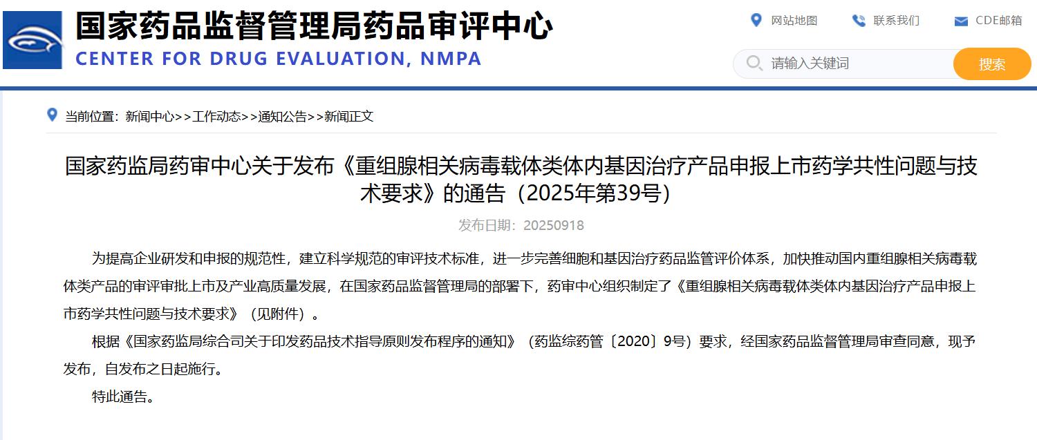 國家藥監局藥審中心關于發布《重組腺相關病毒載體類體內基因治療產品申報上市藥學共性問題與技術要求》的通告(2025年第39號)