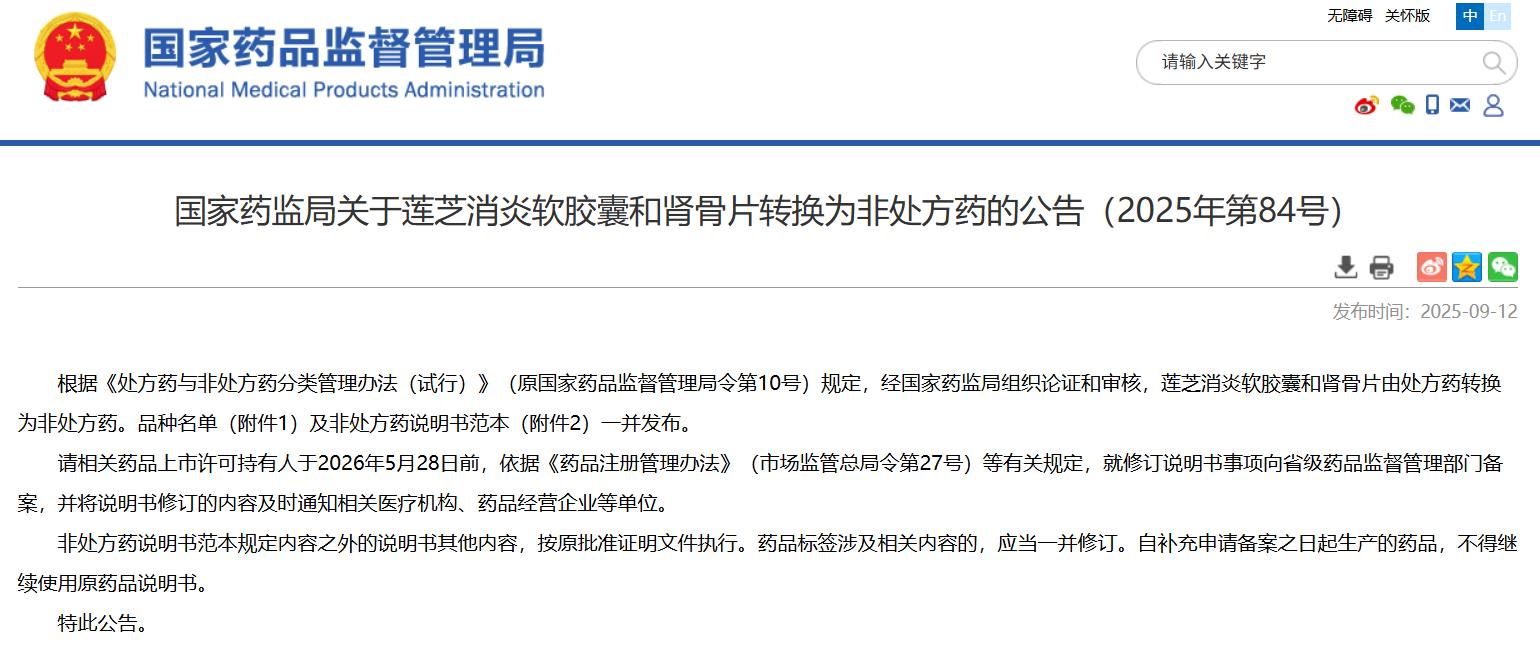 國家藥監局關于蓮芝消炎軟膠囊和腎骨片轉換為非處方藥的公告(2025年第84號)