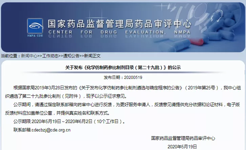 5 月 19 日,CDE 發布化學仿制藥參比制劑目錄第 29 批(征求意見稿),第29 批包括 147 個藥品,其中還有 4 個品規未通過審議。