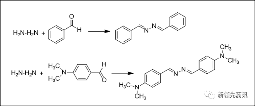 3)苯甲醛/對二甲基苯甲醛與肼反應生成苯甲醛吖嗪/對二甲氨基芐連氮黃色化合物