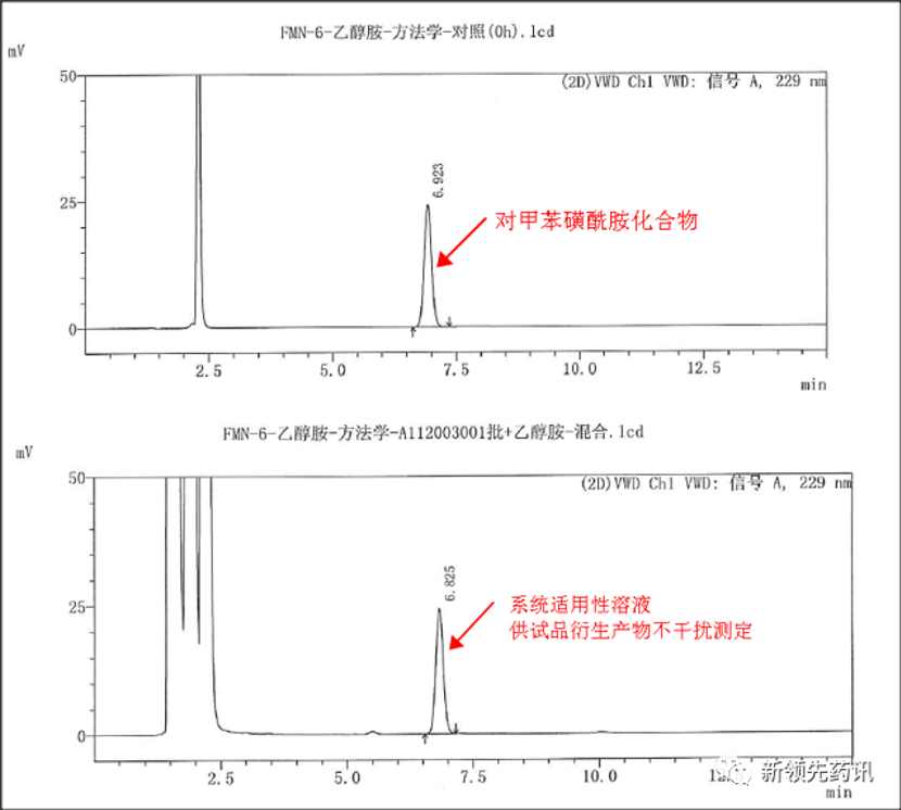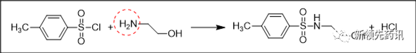 研究思路:需要對起始原料乙醇胺進行研究,該化合物無紫外吸收,GC響應較弱,結構為伯胺,考慮采用對甲苯磺酰氯衍生生成對甲苯磺酰胺化合物,引入較強共軛,可采用HPLC進行測定。