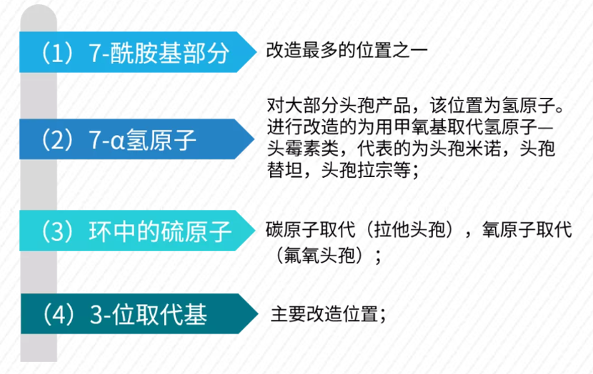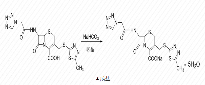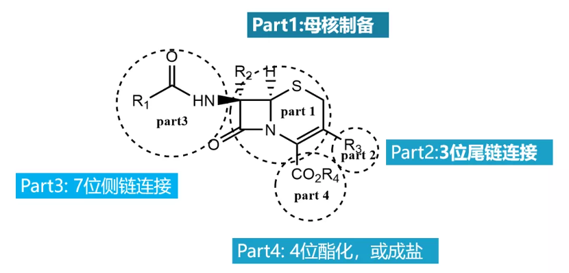 以青霉素G鉀鹽(β-內酰胺并五元環,主結構與青霉素類一致)為起始物料,經擴環等多步反應完成。