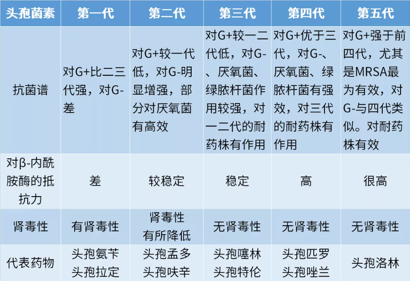 將已上市的頭孢菌素劃分為5類,各類頭孢菌素特征總結如下表: