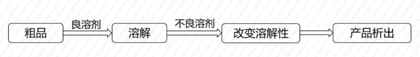 將粗品溶于溶解性好的溶劑(良溶劑)中,然后滴加溶解性不好的溶劑(不良溶劑),通過改變容積比例,進而改變溶劑體系對產品的溶解性,讓產品析出。