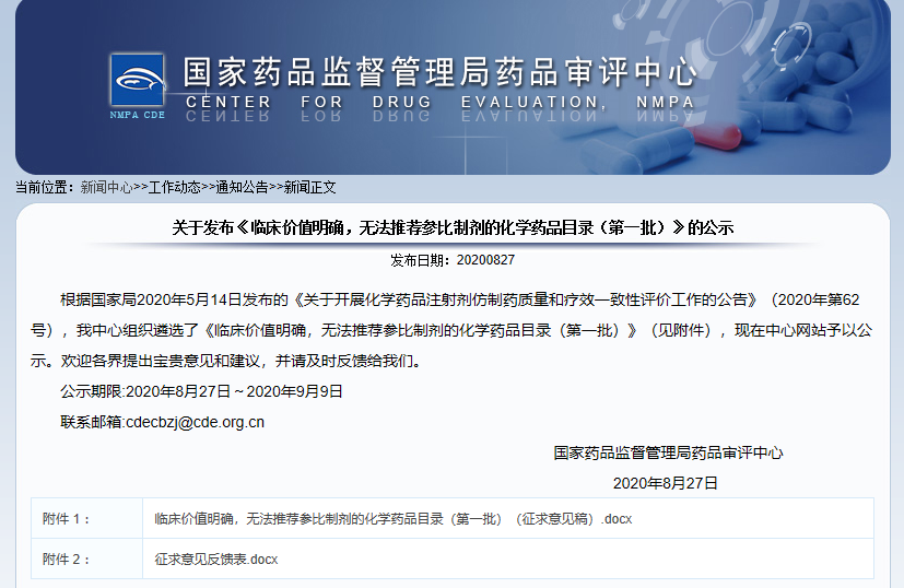 2020年8月27日,CDE發布《臨床價值明確,無法推薦參比制劑的化學藥品目錄(第一批)(征求意見稿)》(以下簡稱《目錄》),該目錄涉及注射劑40個、片劑25個、散劑3個、顆粒劑4個、膠囊劑4個、口服溶液10個,及其他劑型產品共計117個品種。