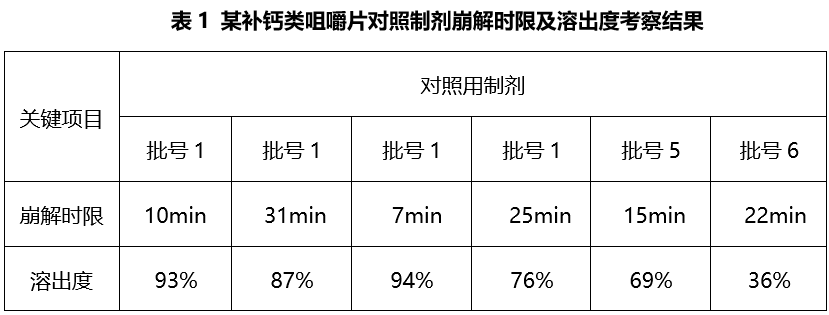 如對于《目錄》中的咀嚼片類品種,中國藥典通則中未對其崩解時限及溶出曲線作硬性規定,且各國藥典收載標準亦未將溶出度列入其質量標準。某補鈣類咀嚼片,研究人員對主流國家上市的不同批次對照制劑進行崩解時限及溶出度考察,結果表明崩解時限和溶出度的批間差異較大,六批對照制劑的崩解時限在7~30min不等,在鹽酸介質中30min溶出度在36%~97%不等,相關數據見表1。