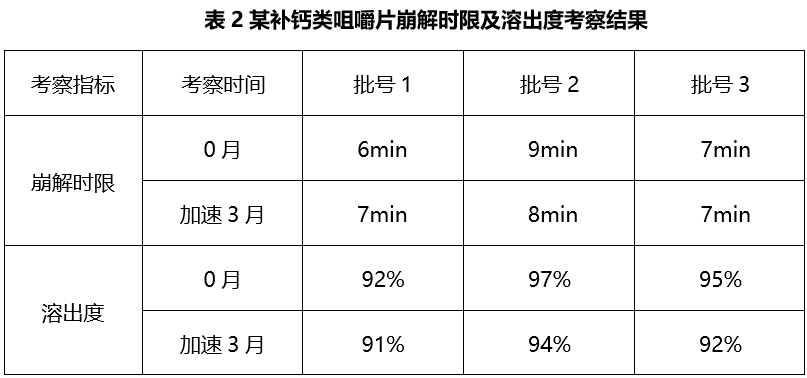 為有效的控制自制品的批間均一性及貨架期間穩定性,為生產參數的制定提供依據,同時保證咀嚼片在臨床使用期間由于部分人群咀嚼不完全導致臨床療效的差異,故推薦按照普通速釋片的崩解時限及溶出度標準確定咀嚼片的控制標準。參考USP<2040>相關規定將某補鈣類咀嚼片內控崩解時限擬定為不得過30min,參考USP同品種普通速釋片劑將在鹽酸介質中30min的溶出度擬定為不得過75%。對多批次自制品進行考察,結果見表2。