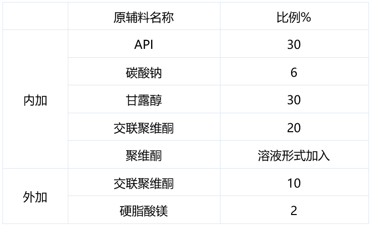 2)稱量: 稱取處方量的原料藥、甘露醇、交聯(lián)聚維酮(內(nèi)加)、無水碳酸鈉備用;