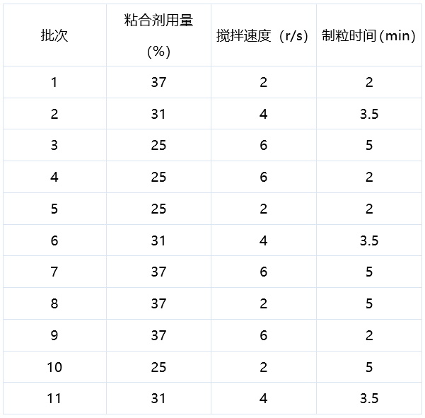 結(jié)論: 粘合劑用量和攪拌速度為影響顆粒粒度分布的關(guān)鍵工藝參數(shù),后續(xù)重點(diǎn)關(guān)注放大驗(yàn)證時(shí)粘合劑用量及攪拌速度的選擇。