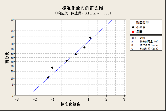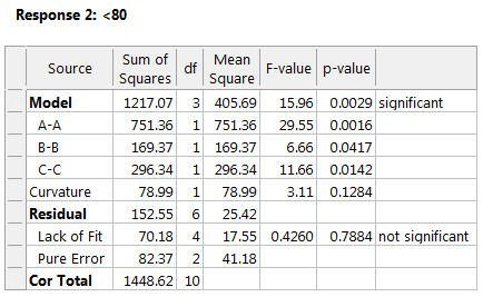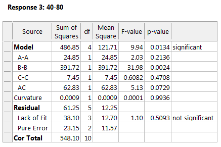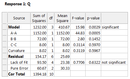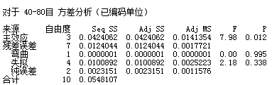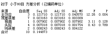 結(jié)論: 通過模型優(yōu)化能獲得 整體模型主效應(yīng)P<0.05,模型有效,未出現(xiàn)明顯彎曲及失擬現(xiàn)象。 (以上數(shù)據(jù)為通過minitab及design expert軟件相互印證證明模型有效性)