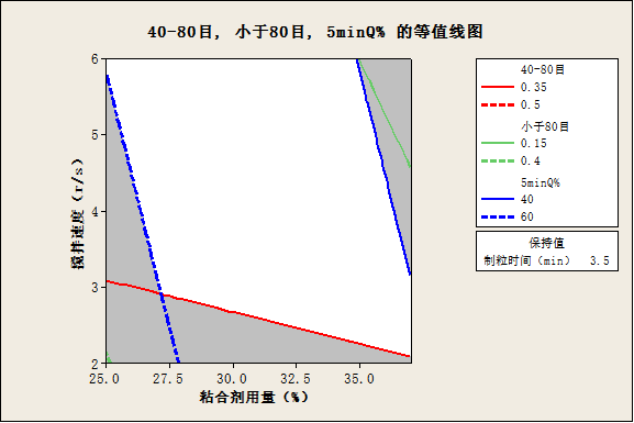 以5min溶出度、小于80目粒度分布及40-80目粒度分布為考察指標(biāo),制定合理的目標(biāo)范圍,通過回歸方程模擬獲得本品的工藝設(shè)計(jì)區(qū)間,目標(biāo)值設(shè)定如下: