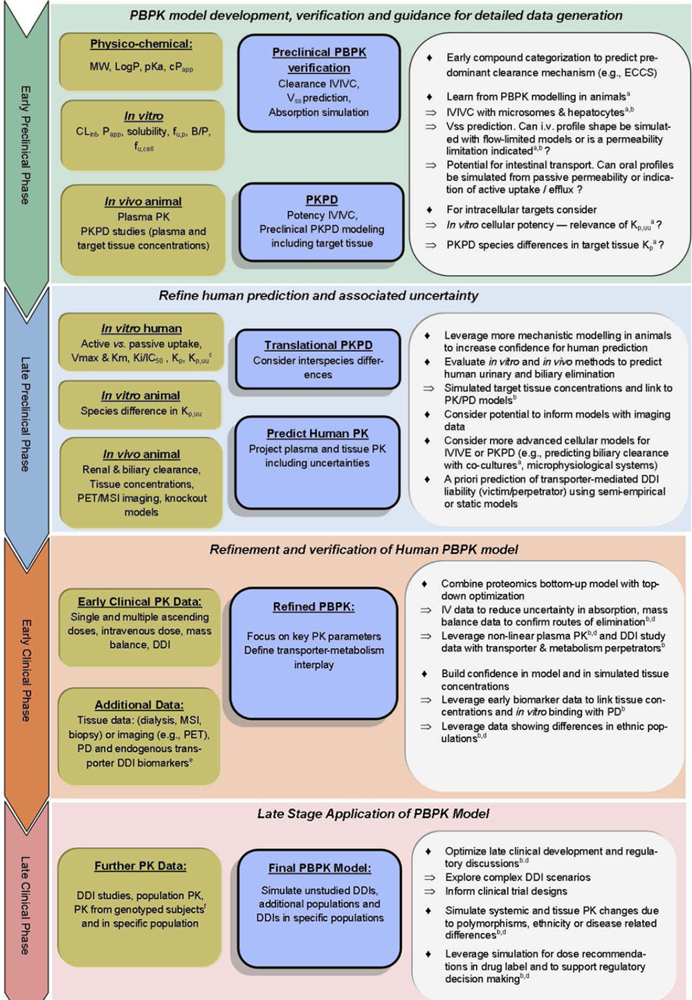 因?yàn)樵谀承┨囟ńM織器官中,該模型使用了特定的參數(shù)和微分方程,這也使得在一些藥物并用或聯(lián)合給藥治療的情況下,可以去預(yù)測有無誘導(dǎo)劑或抑制劑存在情形的特殊族群藥代動(dòng)力學(xué)特點(diǎn),這為其在新藥研發(fā)策略的提供、臨床試驗(yàn)方案的設(shè)計(jì)和臨床試驗(yàn)成功率的提高方面提供了重要參考價(jià)值和指導(dǎo)意見。來自禮來,默克,羅氏等國際制藥先端企業(yè)的科學(xué)家也為PBPK建模在公司新藥研發(fā)應(yīng)用的流程做出了詳細(xì)歸納和總結(jié)[4]。