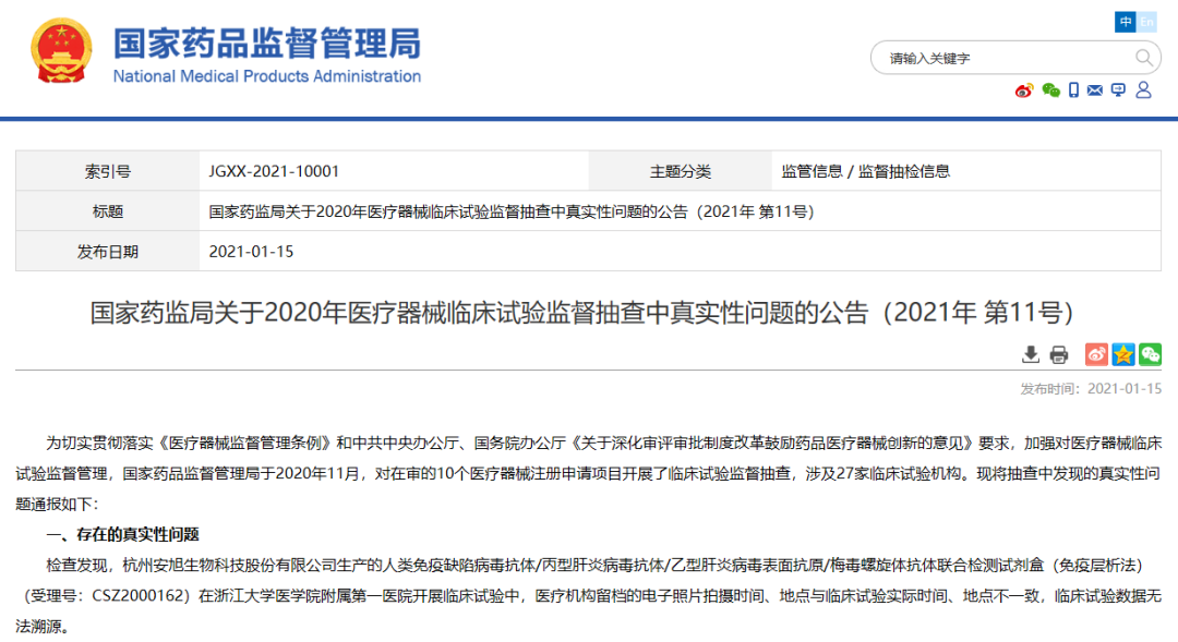 關(guān)于2020年醫(yī)療器械臨床試驗(yàn)監(jiān)督抽查中真實(shí)性問(wèn)題的公告(2021年 第11號(hào))