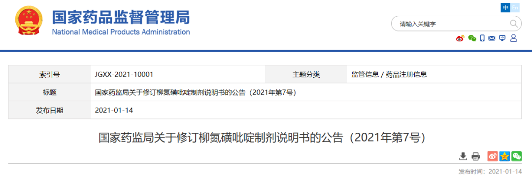 關(guān)于修訂柳氮磺吡啶制劑說(shuō)明書的公告(2021年第7號(hào))