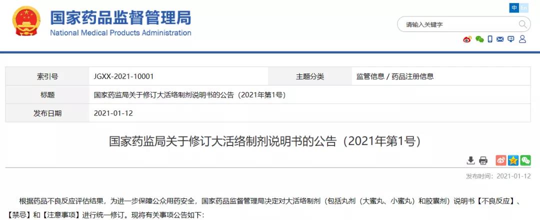 關(guān)于修訂大活絡(luò)制劑說(shuō)明書的公告(2021年第1號(hào))