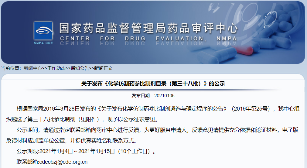 關于發布《化學仿制藥參比制劑目錄(第三十八批)》的公示