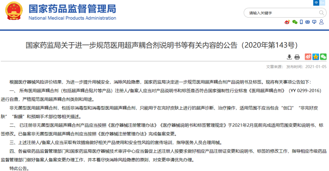 關于進一步規范醫用超聲耦合劑說明書等有關內容的公告(2020年第143號)
