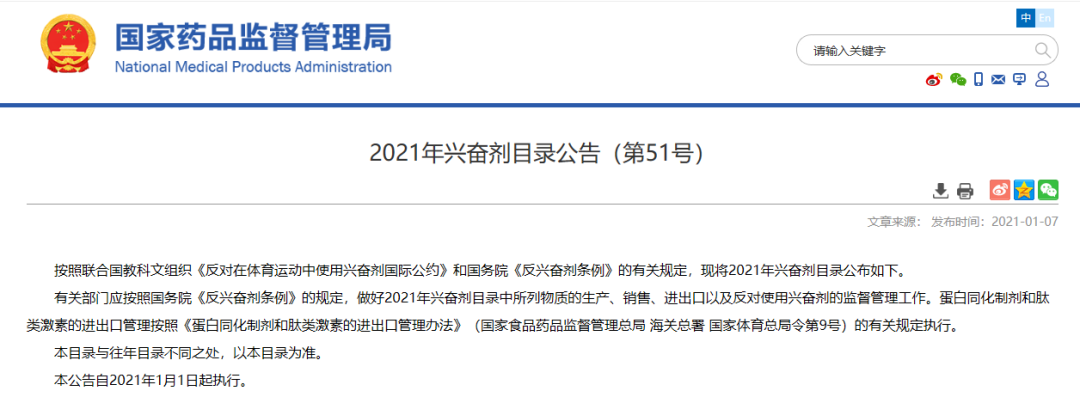有關部門應按照國務院《反興奮劑條例》的規定,做好2021年興奮劑目錄中所列物質的生產、銷售、進出口以及反對使用興奮劑的監督管理工作。蛋白同化制劑和肽類激素的進出口管理按照《蛋白同化制劑和肽類激素的進出口管理辦法》(國家食品藥品監督管理總局 海關總署 國家體育總局令第9號)的有關規定執行。