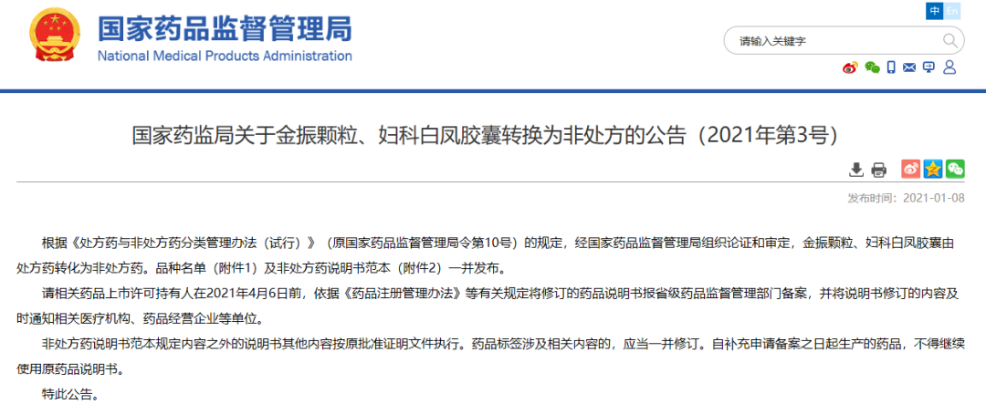 關于金振顆粒、婦科白鳳膠囊轉換為非處方的公告(2021年第3號)