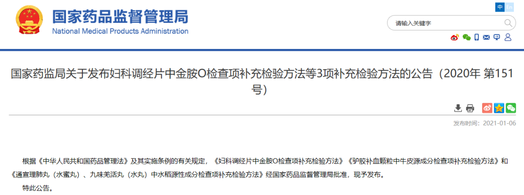 關于發布婦科調經片中金胺O檢查項補充檢驗方法等3項補充檢驗方法的公告(2020年 第151號)