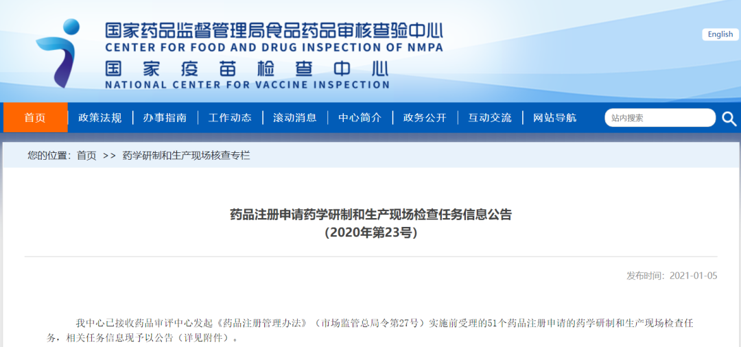 藥品注冊申請藥學研制和生產現場檢查任務信息公告 (2020年第23號)