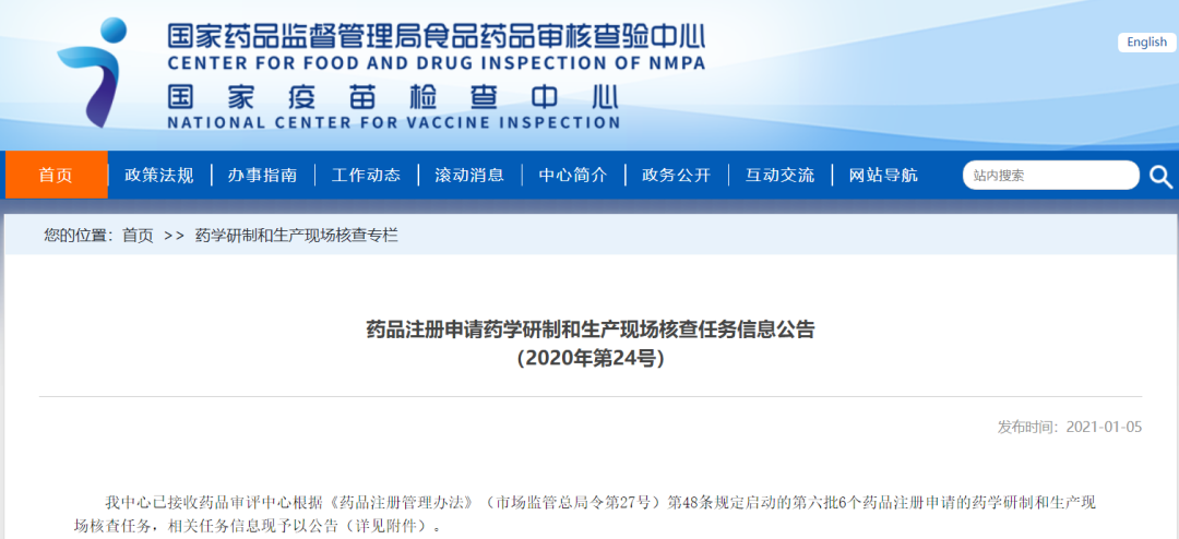藥品注冊申請藥學研制和生產現場核查任務信息公告 (2020年第24號)
