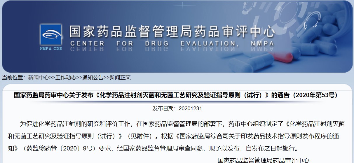 關于發布《化學藥品注射劑滅菌和無菌工藝研究及驗證指導原則(試行)》的通告(2020年第53號)