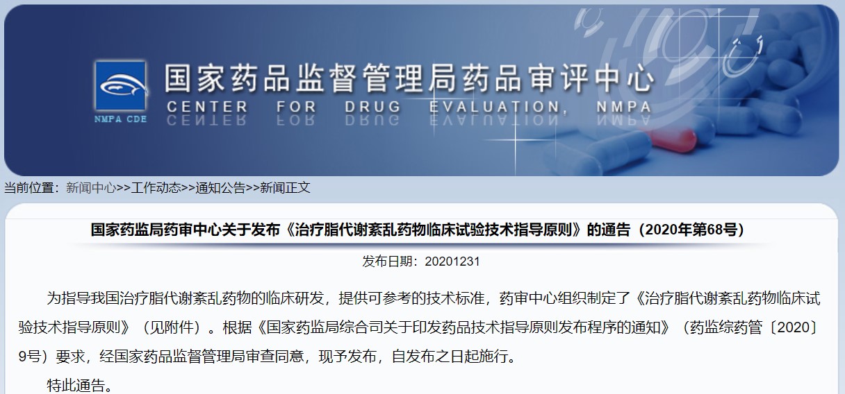 關于發布《治療脂代謝紊亂藥物臨床試驗技術指導原則》的通告(2020年第68號)