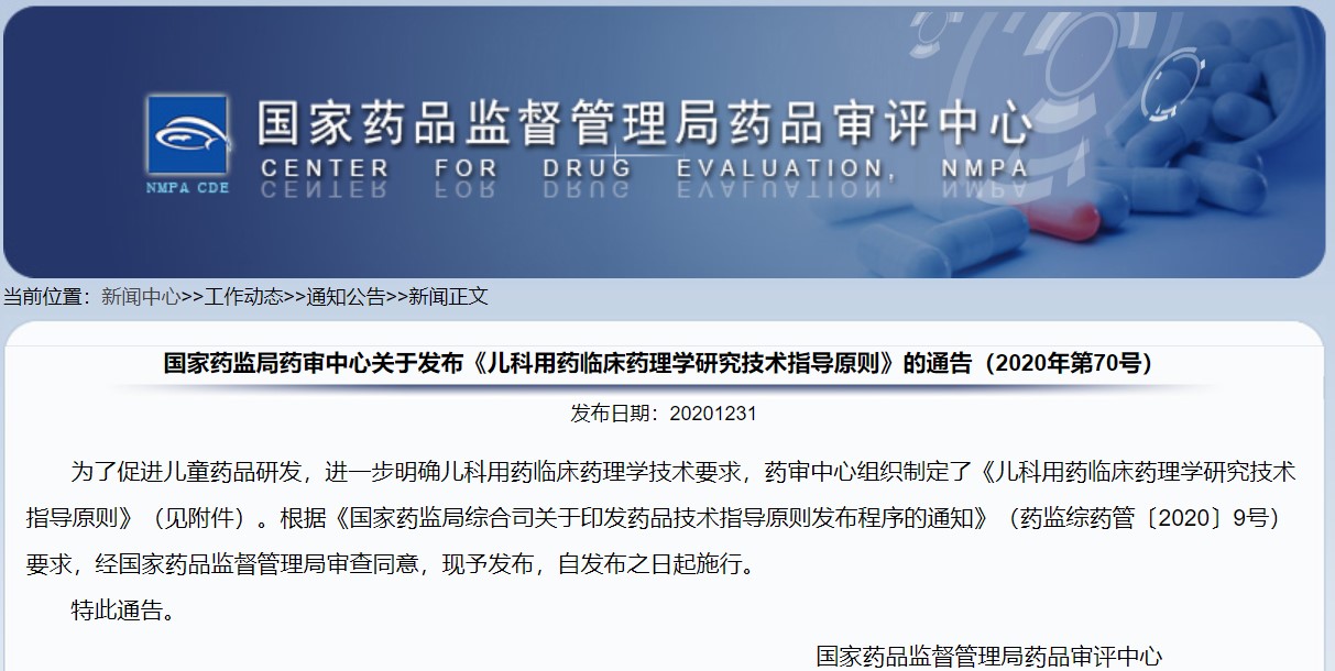 關于發布《兒科用藥臨床藥理學研究技術指導原則》的通告(2020年第70號)