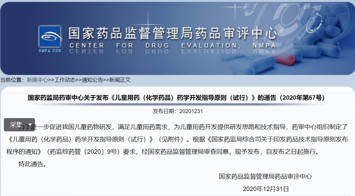 關于發布《兒童用藥(化學藥品)藥學開發指導原則(試行)》的通告(2020年第67號)