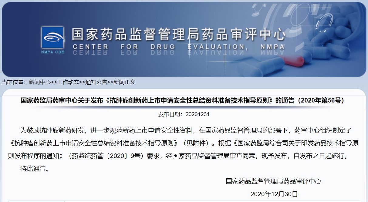 關于發布《抗腫瘤創新藥上市申請安全性總結資料準備技術指導原則》的通告(2020年第56號)