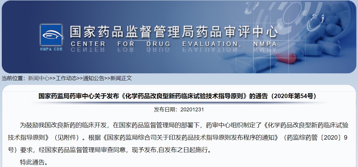 關于發布《化學藥品改良型新藥臨床試驗技術指導原則》的通告(2020年第54號)