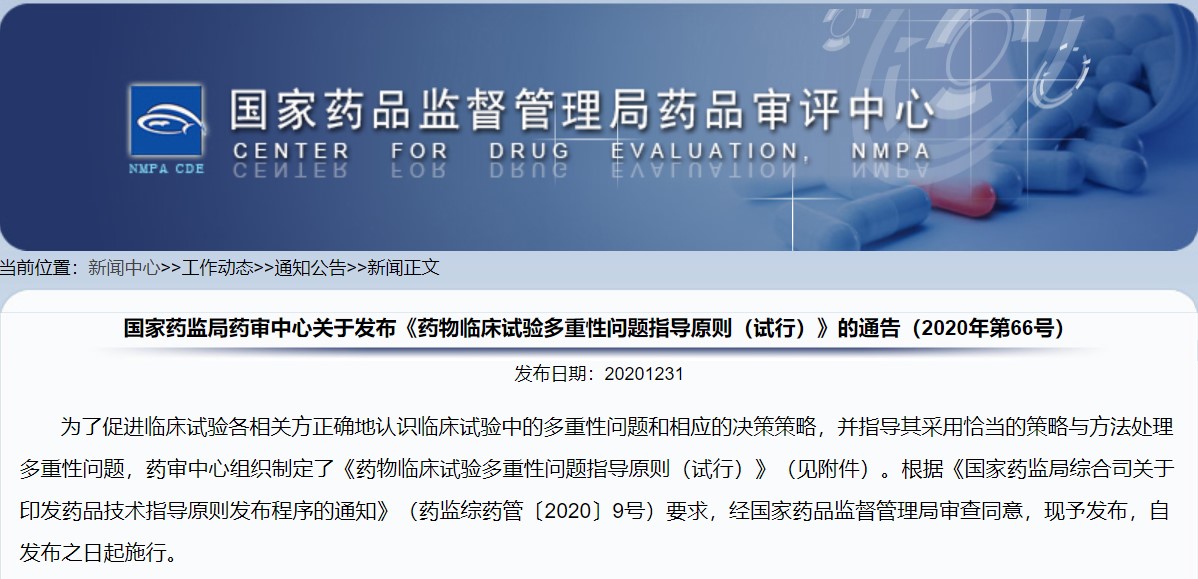 關于發布《藥物臨床試驗多重性問題指導原則(試行)》的通告(2020年第66號)