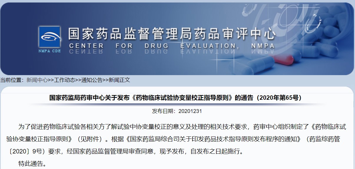 關于發布《藥物臨床試驗協變量校正指導原則》的通告(2020年第65號)