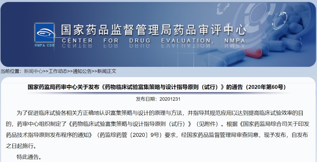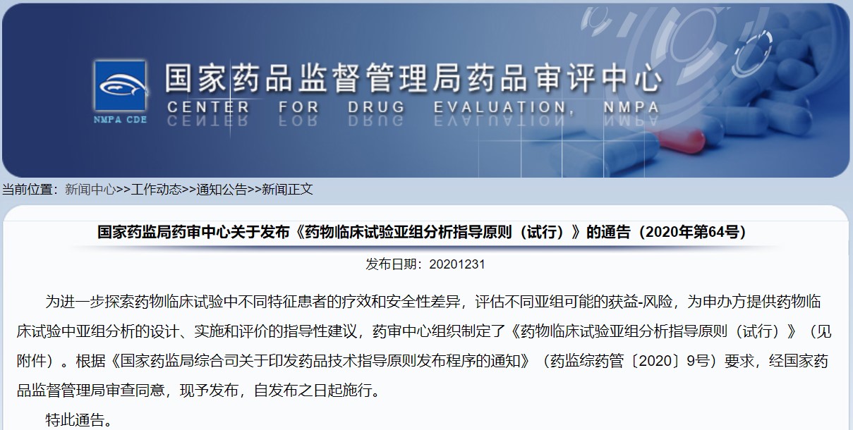 關于發布《藥物臨床試驗亞組分析指導原則(試行)》的通告(2020年第64號)
