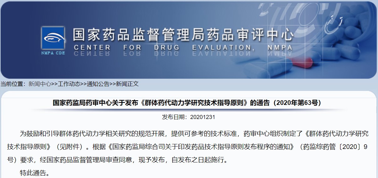 關于發布《群體藥代動力學研究技術指導原則》的通告(2020年第63號)