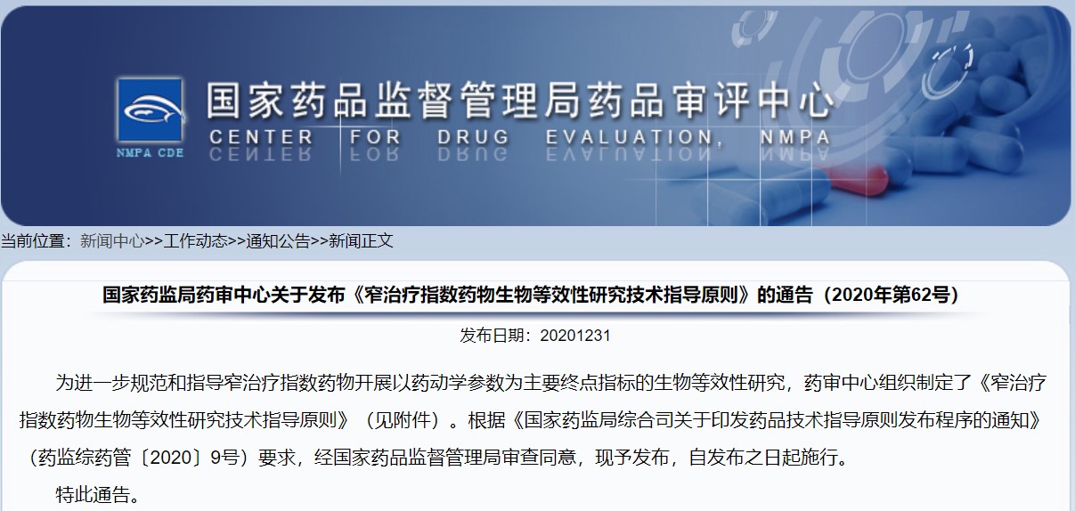 關于發布《窄治療指數藥物生物等效性研究技術指導原則》的通告(2020年第62號)