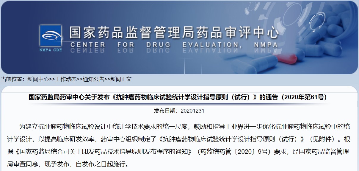 關于發布《抗腫瘤藥物臨床試驗統計學設計指導原則(試行)》的通告(2020年第61號)