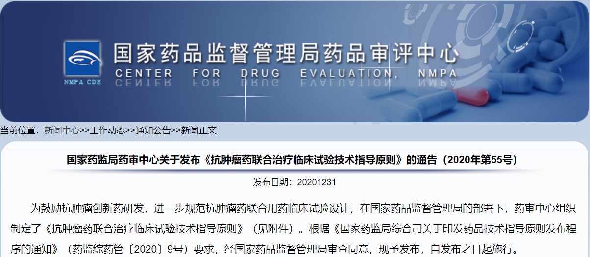 關于發布《抗腫瘤藥聯合治療臨床試驗技術指導原則》的通告(2020年第55號)