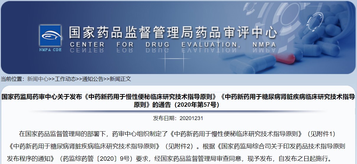 關于發布《中藥新藥用于慢性便秘臨床研究技術指導原則》《中藥新藥用于糖尿病腎臟疾病臨床研究技術指導原則》的通告(2020年第57號)