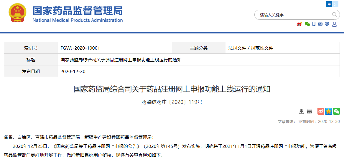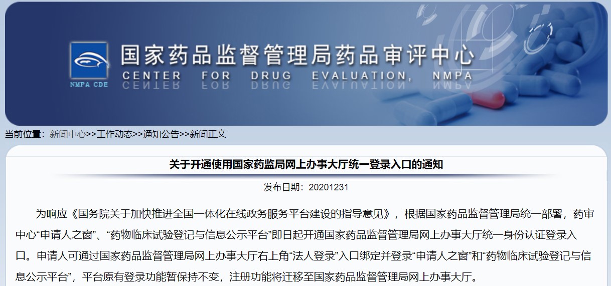 為落實《國務院辦公廳關于印發進一步深化“互聯網+政務服務”推進政務服務“一網、一門、一次”改革實施方案的通知》(國辦發〔2018〕45號)和《國務院辦公廳關于加快推進政務服務“跨省通辦”的指導意見》(國辦發〔2020〕35號)有關要求,國家藥監局已開通藥品注冊事項網上申報功能,并于2021年1月1日正式上線運行。