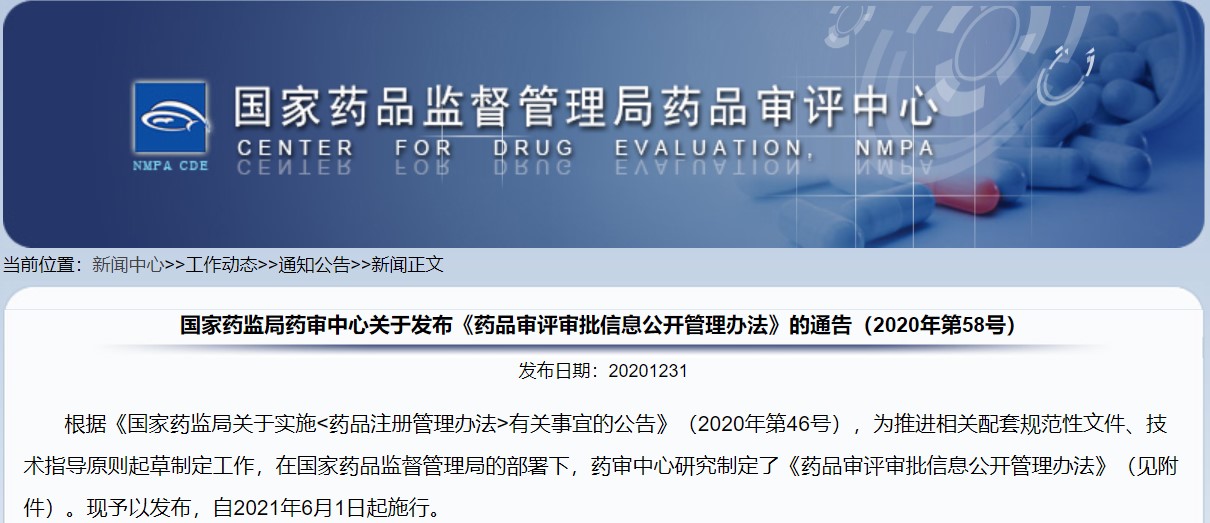 關于發布《藥品審評審批信息公開管理辦法》的通告(2020年第58號)