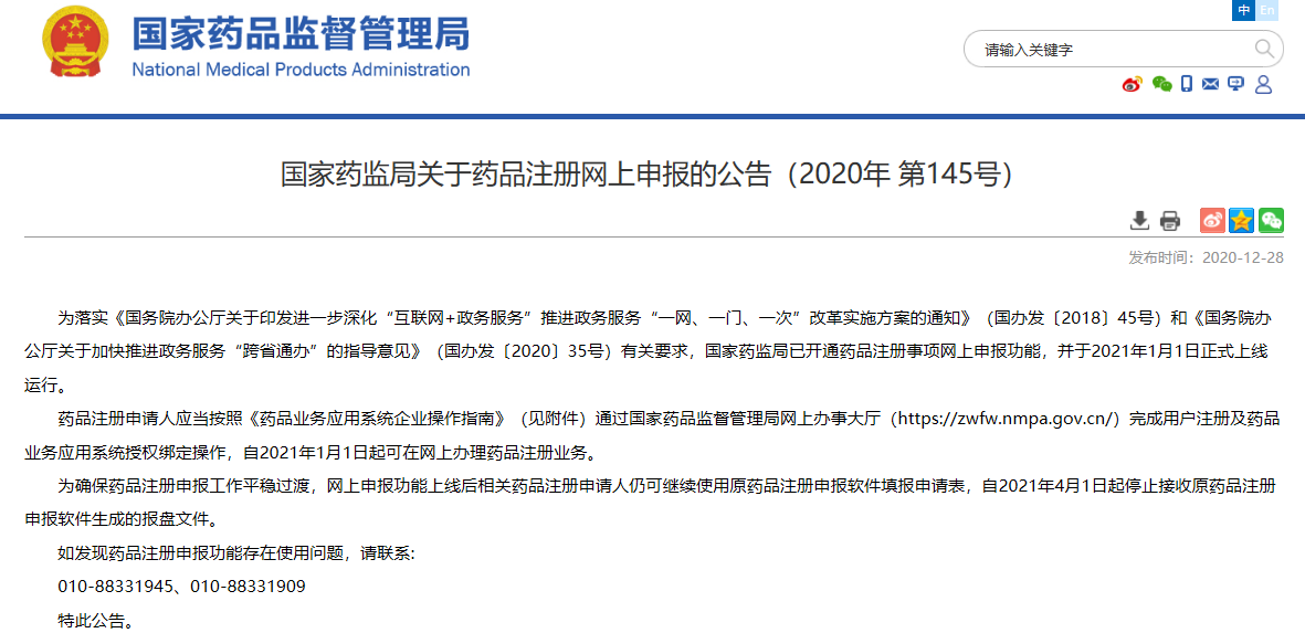 關于藥品注冊網上申報的公告(2020年 第145號)