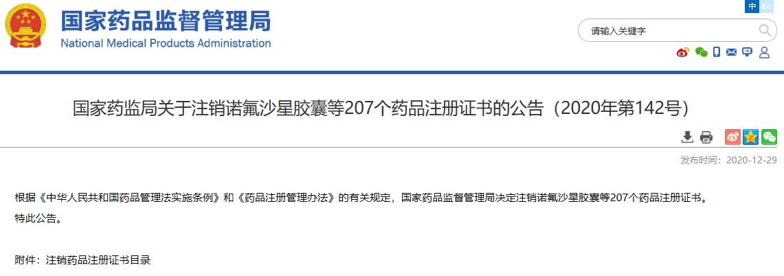 關于注銷諾氟沙星膠囊等207個藥品注冊證書的公告(2020年第142號)