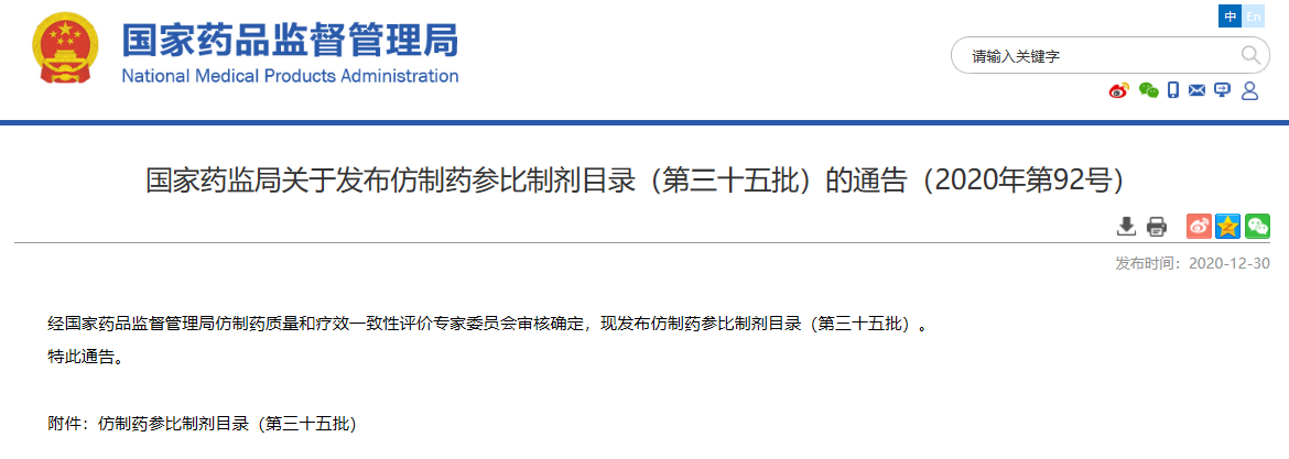 關于發布仿制藥參比制劑目錄(第三十五批)的通告(2020年第92號)